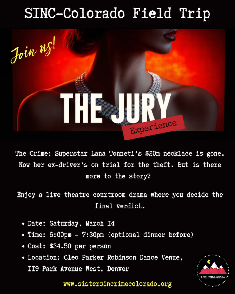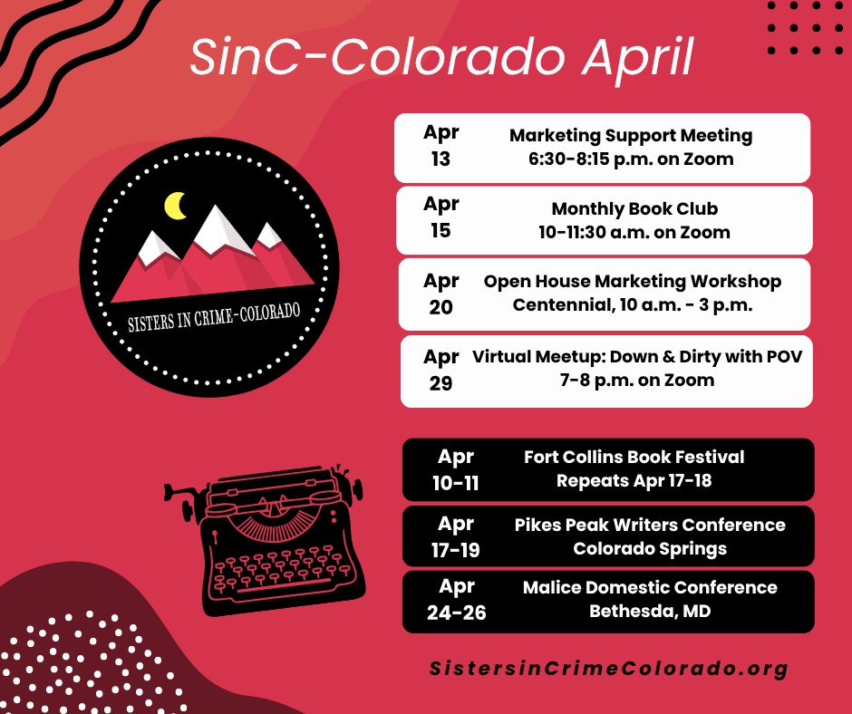 Sisters in Crime Worldwide stresses inclusion, education, and fellowship. Our Colorado chapter is no different. We are proud to have generous and talented men and women in our ranks, and we welcome all who want to join us. We thrive on our abundant opportunities to learn more about the craft of writing as well as hear from professionals who further our understanding of law enforcement topics to add realism to our books. We love to get together with our SinC-CO members for workshops, parties, field trips, and book events, and try to create ample opportunities for all of it.