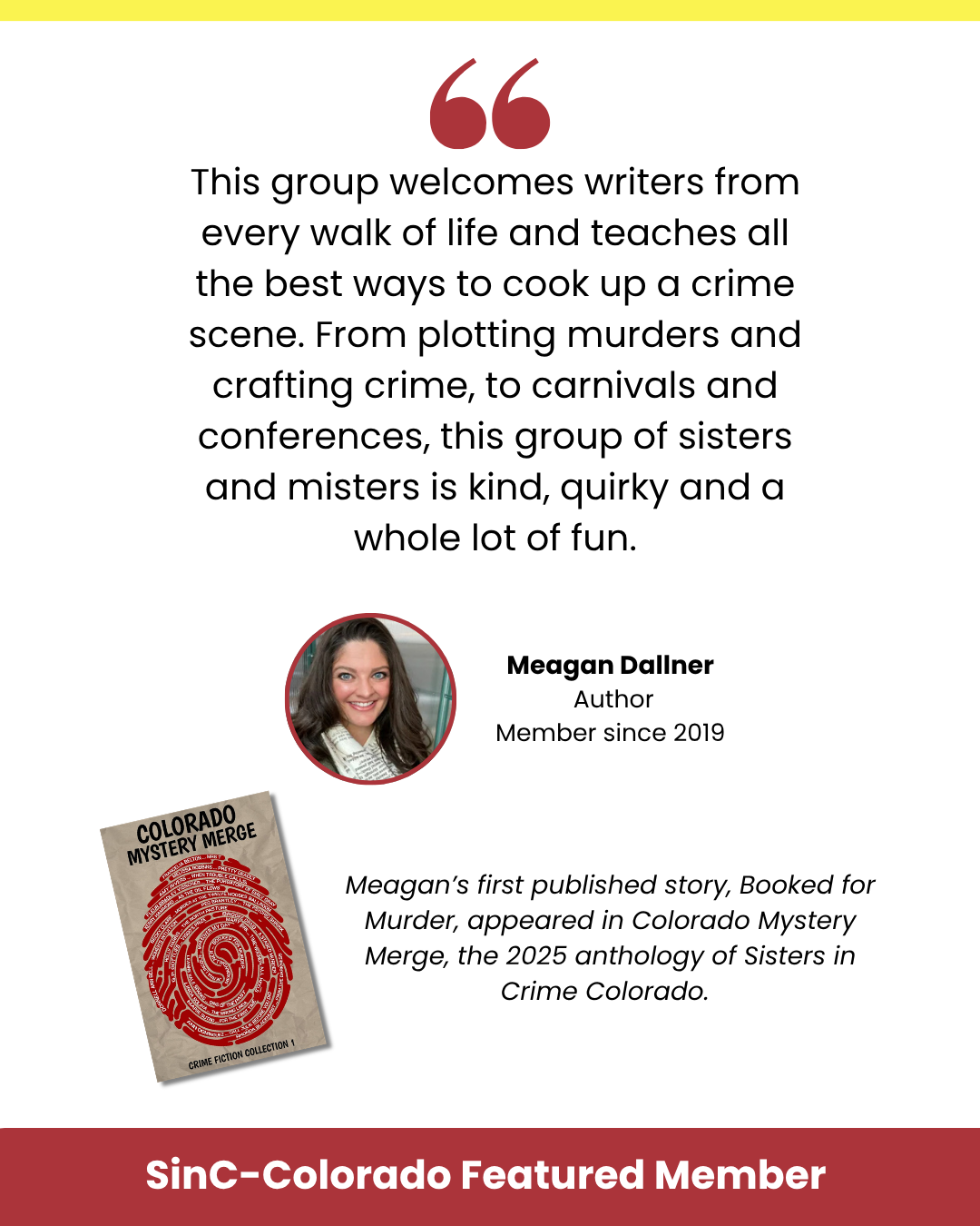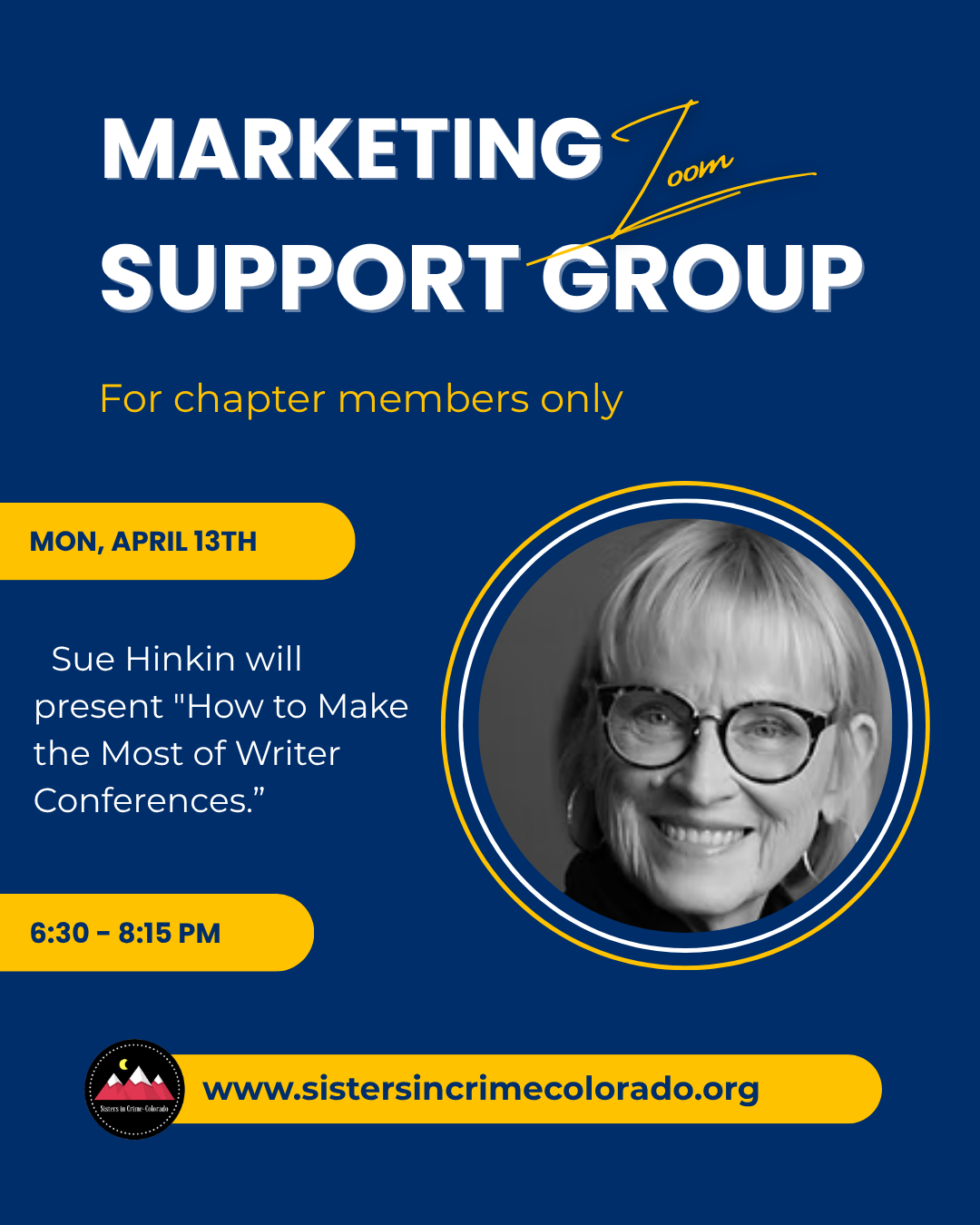 You'll receive oodles of opportunities to learn, mentor, promote and help make this a vibrant organization, all while growing professionally and personally with the Sisters in Crime-Colorado community.