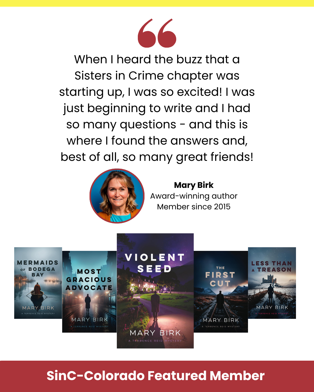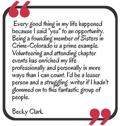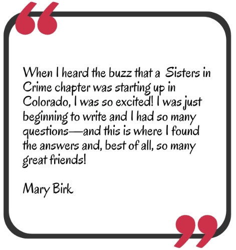 In July 2015, a handful of women got together at a library to discuss the feasibility of starting a Colorado chapter of Sisters in Crime. It was such a joyous, laugh-filled meeting that a librarian poked her head in and said that if the group we were forming was as much fun as the organizational meeting, she wanted to join. The people around the table entered the room strangers, and left friends. The majority of them have been members ever since.