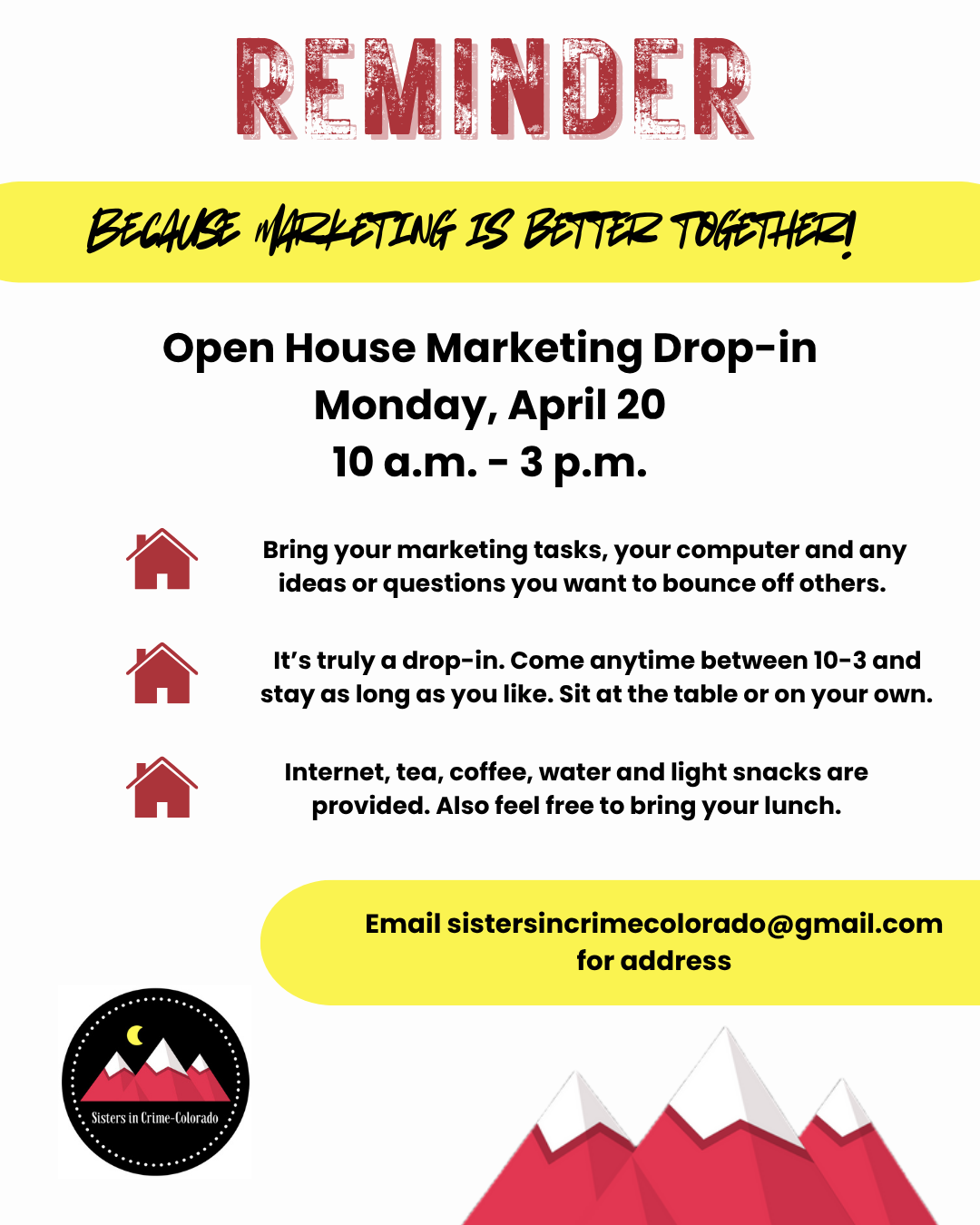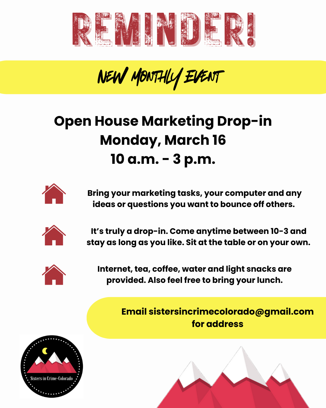 You'll receive oodles of opportunities to learn, mentor, promote, and help make this a vibrant organization, all while growing professionally and personally with the Sisters in Crime-Colorado community.