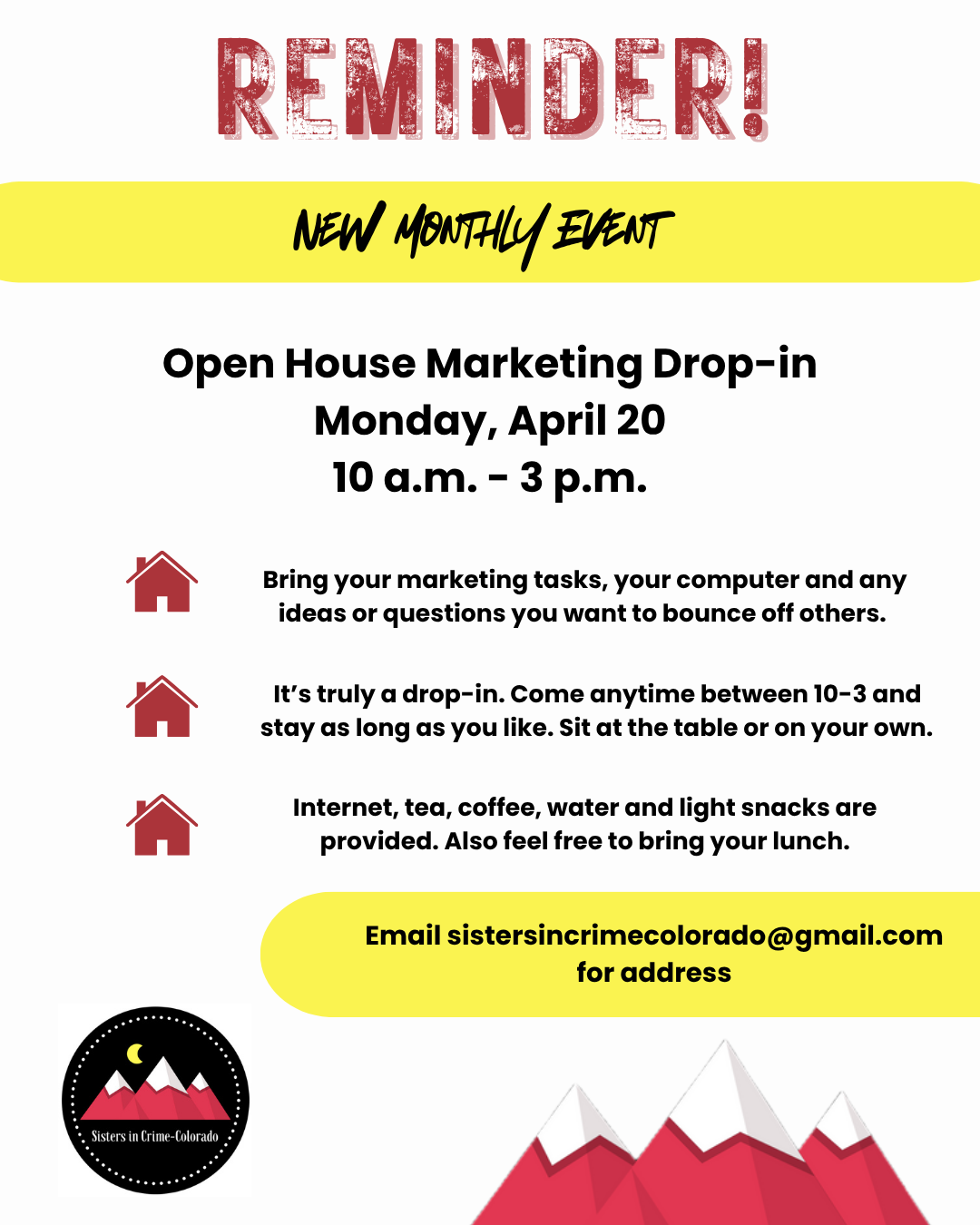 Our Marketing Support Group offers two opportunities each month for members to come together, pool our knowledge and support each other in completing marketing-related tasks: